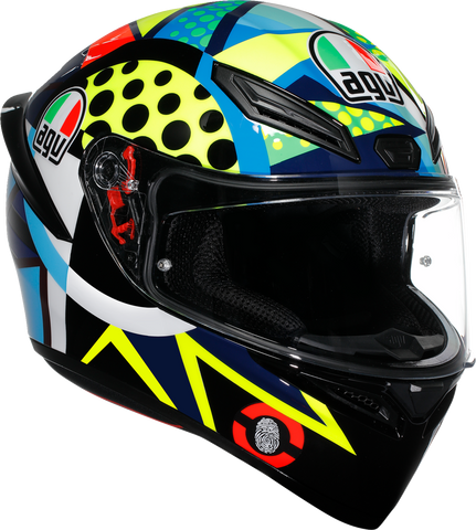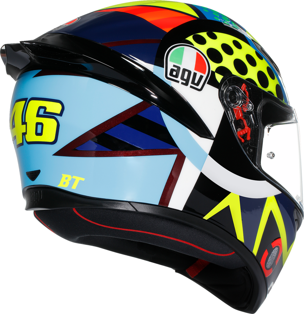 The AGV K1 S Rossi Winter Test 2020 helmet combines advanced safety features with aerodynamic design for optimal performance and protection on the road. This helmet features a double D retention system ensuring secure closure and quick release for convenience. Its shell is constructed with high resistance thermoplastic, providing durability while maintaining lightweight comfort for extended wear. The helmet includes a 4-density EPS liner that absorbs impact energy effectively, enhancing rider safety in case of collision. Designed with a collarbone-safe profile, it minimizes chafing and pressure points for a more comfortable fit during long rides. Ventilation is optimized with two rear extractors and five front vents, along with adjustable air vents that allow riders to customize airflow and stay cool in various weather conditions. An integrated spoiler improves aerodynamics, reducing drag and turbulence at high speeds, while the 190° horizontal field of view ensures excellent peripheral vision for increased situational awareness. The multistep visor mechanism and micro-opening system enable quick, effortless visor adjustments, complemented by an anti-scratch visor that enhances durability and clarity. The helmet's interior is lined with Dry-Comfort fabric, providing moisture-wicking properties and comfort, and is designed to fit glasses comfortably. The removable and washable interior padding allows for easy maintenance and long-term freshness. Additional features include a removable nose guard and wind protector for enhanced protection against the elements, ready for compatibility with a generic communication system for seamless connectivity. The Extra Quick Release System (XQRS) ensures swift helmet removal, while the Pinlock® 70 MaxVision™ prepared visor (not included) offers fog-resistant performance, maintaining clear vision in challenging conditions. Overall, the AGV K1 S Rossi Winter Test 2020 helmet offers a combination of safety, comfort, and aerodynamic efficiency for motorcycle enthusiasts seeking reliable protection and high-performance features. Its well-thought-out design makes it suitable for various riding conditions, providing versatility and peace of mind for riders of all levels.