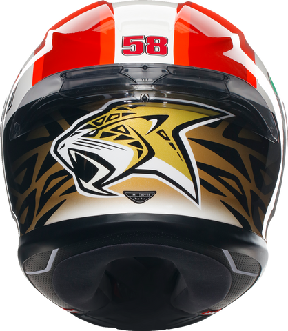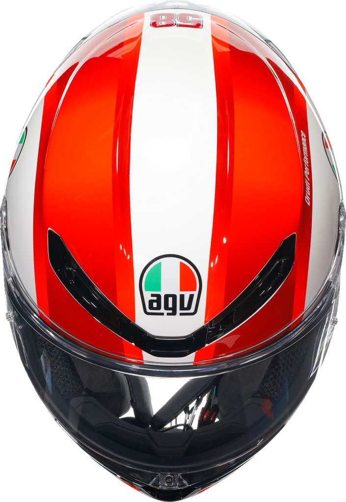 Wind protector included, Double D retention system, Shell, 5-density EPS, Carbon-Aramid fiber, Collarbone safe profile, Ventilation, Adjustable air vents, One wide rear extractor and five front vents, Aerodynamics, Integrated spoiler, Shell shape designed to reduce turbulence, Optimized for all riding positions, Interior, 2Dry: instant sweat absorption, Ritmo fabric cheek pads to facilitate putting on/taking off the helmet, with cheekbone area in Shalimar fabric to ensure stability at high speed, Embracing neck roll profile, Cheek pads safety release system, Fit especially designed to allow wearing glasses, Shalimar fabric crown pad for a soft and gentle touch, Ritmo fabric neck roll and synthetic leather with high abrasion resistance and water-resistant properties, Microsense: premium skin comfort, Ready for AGV ARK communication system, Removable nose guard