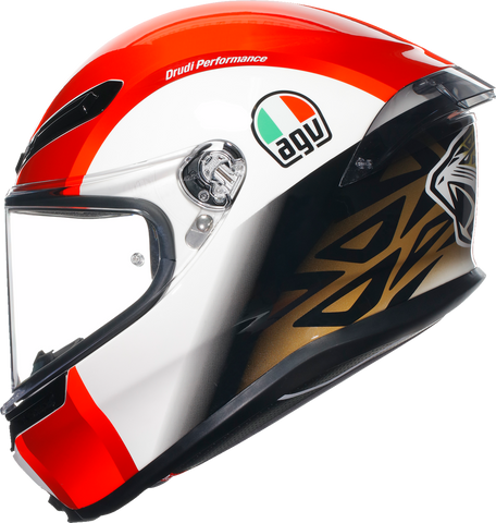 Wind protector included, Double D retention system, Shell, 5-density EPS, Carbon-Aramid fiber, Collarbone safe profile, Ventilation, Adjustable air vents, One wide rear extractor and five front vents, Aerodynamics, Integrated spoiler, Shell shape designed to reduce turbulence, Optimized for all riding positions, Interior, 2Dry: instant sweat absorption, Ritmo fabric cheek pads to facilitate putting on/taking off the helmet, with cheekbone area in Shalimar fabric to ensure stability at high speed, Embracing neck roll profile, Cheek pads safety release system, Fit especially designed to allow wearing glasses, Shalimar fabric crown pad for a soft and gentle touch, Ritmo fabric neck roll and synthetic leather with high abrasion resistance and water-resistant properties, Microsense: premium skin comfort, Ready for AGV ARK communication system, Removable nose guard