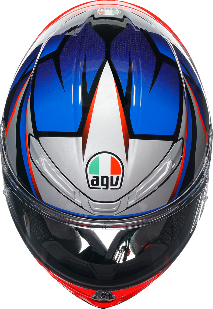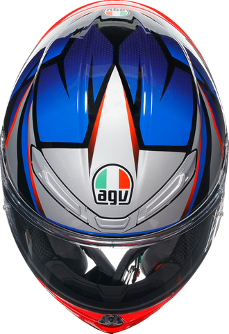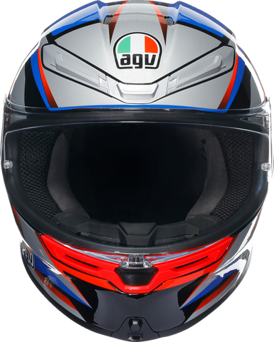Double D retention system, Wind protector included, Shell, Carbon-Aramid fiber, 5-density EPS, Collarbone safe profile, Ventilation, 1 wide rear extractor and 5 front vents, Adjustable air vents, Aerodynamics, Integrated spoiler, Optimized for all riding positions, Shell shape designed to reduce turbulence, Interior, Ritmo fabric cheek pads to facilitate putting on/taking off the helmet, with cheekbone area in Shalimar fabric to ensure stability at high speed, Cheek pads safety release system, 2Dry: instant sweat absorption, Shalimar fabric crown pad for a soft and gentle touch, Ritmo fabric neck roll and synthetic leather with high abrasion resistance and water-resistant properties, Ready for AGV ARK communication system, Microsense: premium skin comfort, Embracing neck roll profile, Fit especially designed to allow wearing glasses, Reflective inserts