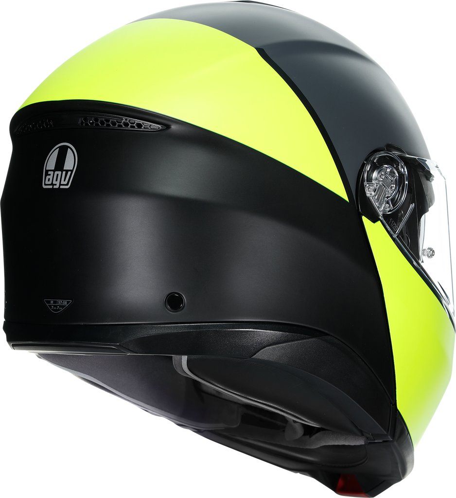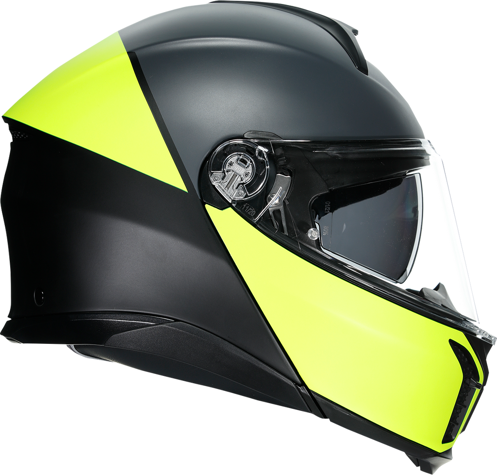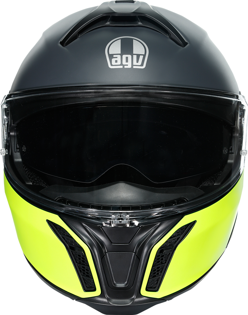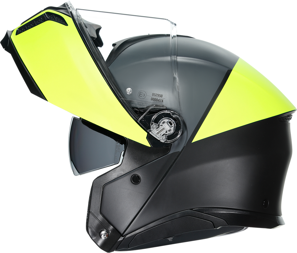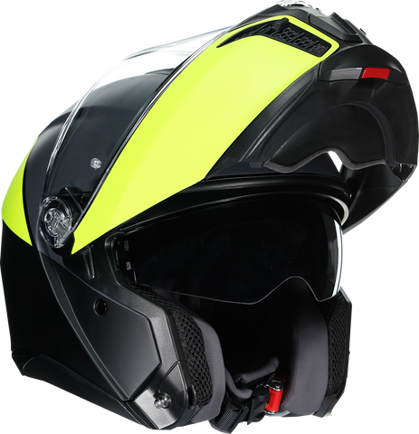 Shell , 5-density EPS, Carbon-Aramid-Fiberglass, Chin guard opening system designed to prevent accidental opening, Metal chin guard block system ensures the double homologation P/J, Collarbone safe profile, Ventilation, Adjustable air vents, One rear extractor and four front vents, Aerodynamics, 2-step chin guard mechanism designed to optimize aerodynamics in jet configuration, Shell shape designed to maximize aerodynamic performance, Interior, 2Dry: instant sweat absorption, Fresh and fluid Ritmo fabric cheek pads * interchangeable between all sizes, Embracing neck roll profile, Crown pad: Shalimar fabric crown pad for a soft and gentle touch, Microsense: premium skin comfort, Fit especially designed to allow wearing glasses, Ritmo fabric and synthetic leather neck roll with high abrasion resistance and water-resistant properties, Ready for AGV INSYDE communication system, Reflective inserts, Removable and washable interiors, Removable nose guard and wind protector