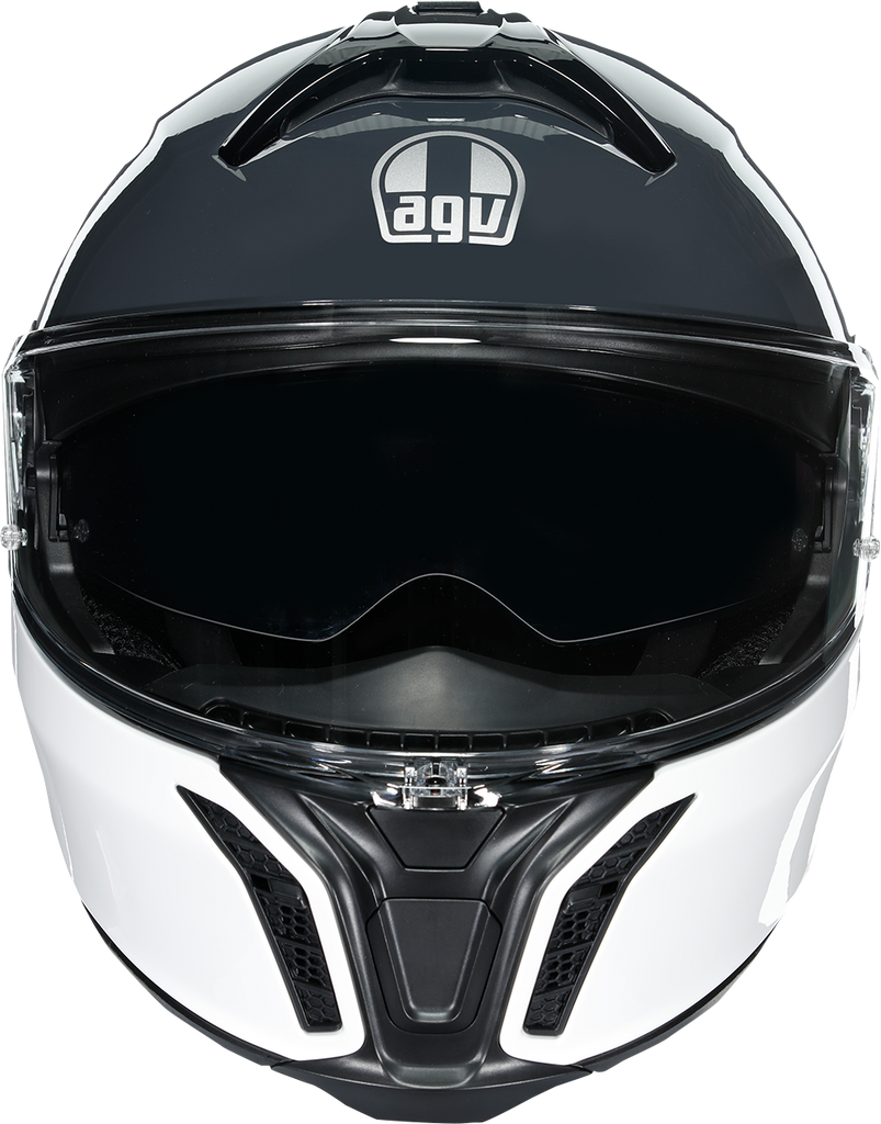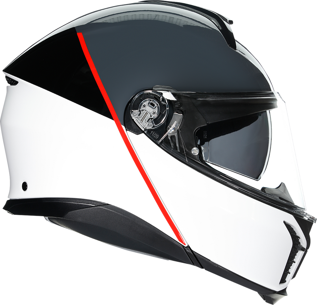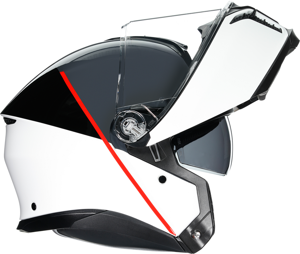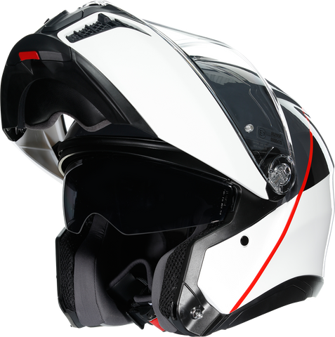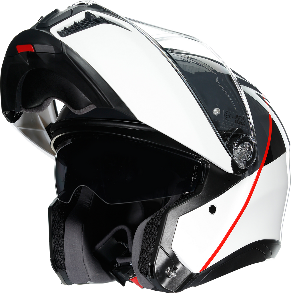 Shell , 5-density EPS, Carbon-Aramid-Fiberglass, Chin guard opening system designed to prevent accidental opening, Metal chin guard block system ensures the double homologation P/J, Collarbone safe profile, Ventilation, Adjustable air vents, One rear extractor and four front vents, Aerodynamics, 2-step chin guard mechanism designed to optimize aerodynamics in jet configuration, Shell shape designed to maximize aerodynamic performance, Interior, 2Dry: instant sweat absorption, Fresh and fluid Ritmo fabric cheek pads * interchangeable between all sizes, Embracing neck roll profile, Crown pad: Shalimar fabric crown pad for a soft and gentle touch, Microsense: premium skin comfort, Fit especially designed to allow wearing glasses, Ritmo fabric and synthetic leather neck roll with high abrasion resistance and water-resistant properties, Ready for AGV INSYDE communication system, Reflective inserts, Removable and washable interiors, Removable nose guard and wind protector
