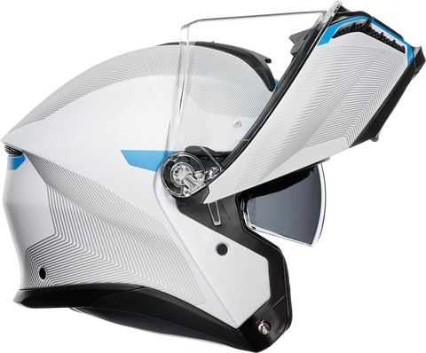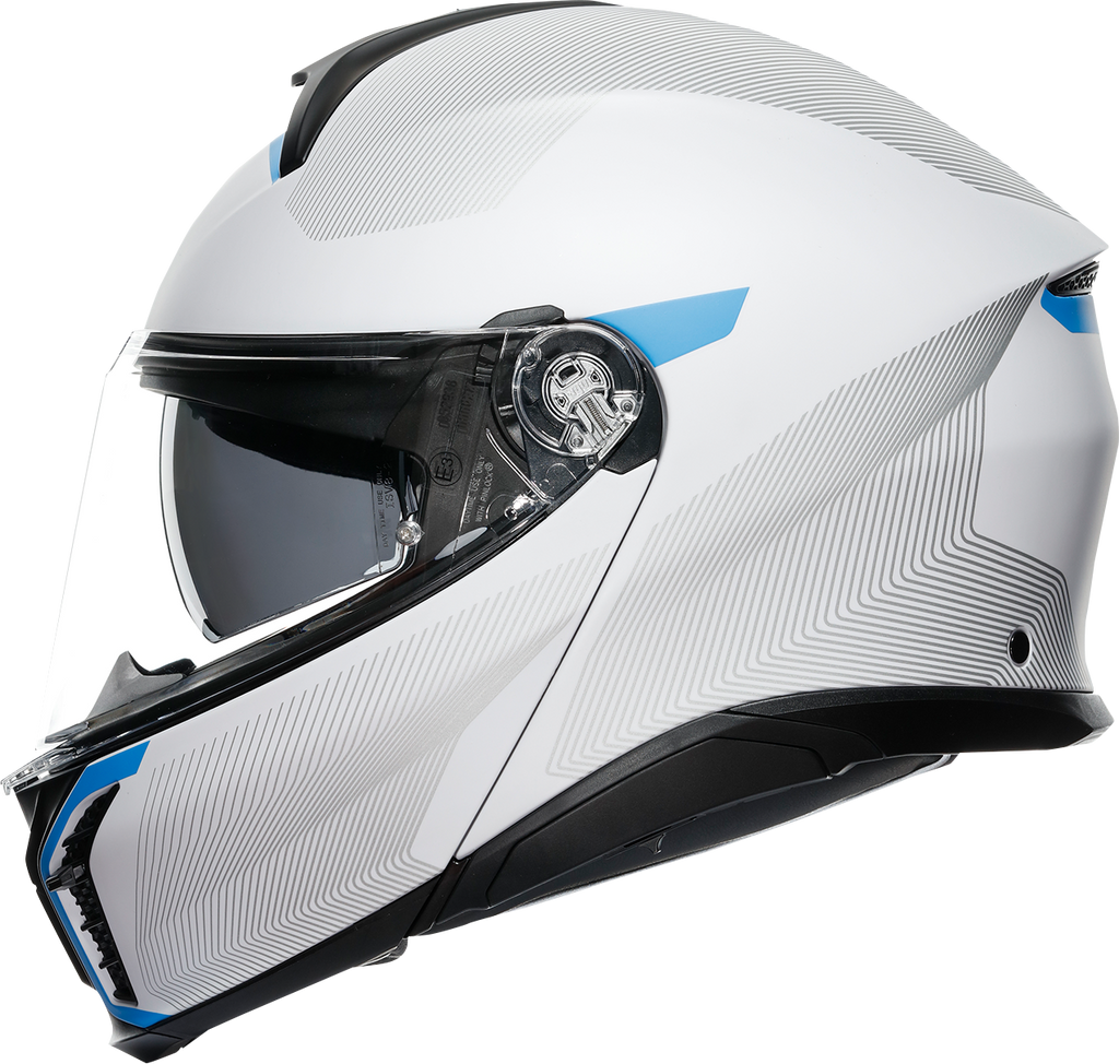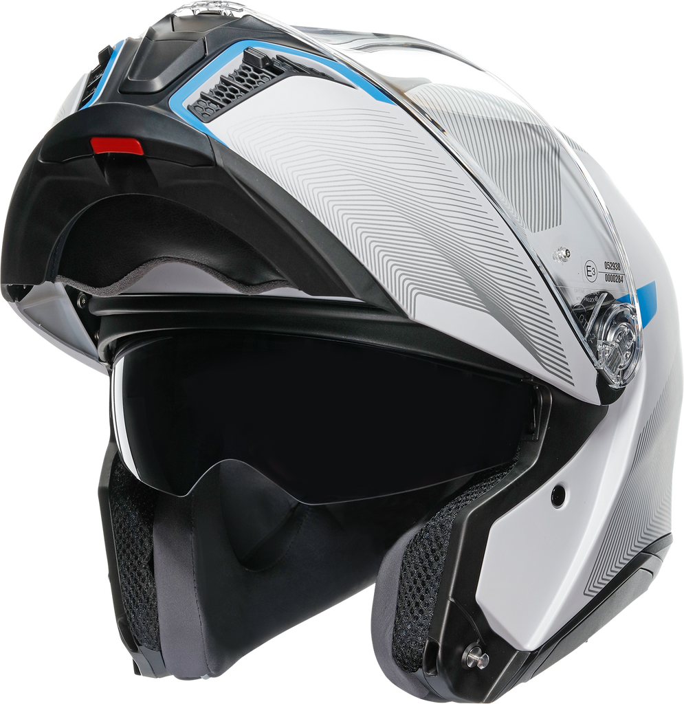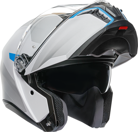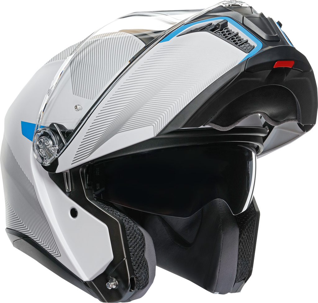 Shell , 5-density EPS, Chin guard opening system designed to prevent accidental opening, Metal chin guard block system ensures the double homologation P/J, Carbon-Aramid-Fiberglass, Collarbone safe profile, Ventilation, Adjustable air vents, One rear extractor and four front vents, Aerodynamics, 2-step chin guard mechanism designed to optimize aerodynamics in jet configuration, Shell shape designed to maximize aerodynamic performance, Interior, 2Dry: instant sweat absorption, Fresh and fluid Ritmo fabric cheek pads * interchangeable between all sizes, Crown pad: Shalimar fabric crown pad for a soft and gentle touch, Fit especially designed to allow wearing glasses, Embracing neck roll profile, Microsense: premium skin comfort, Ritmo fabric and synthetic leather neck roll with high abrasion resistance and water-resistant properties, Ready for AGV INSYDE communication system, Reflective inserts, Removable and washable interiors, Removable nose guard and wind protector