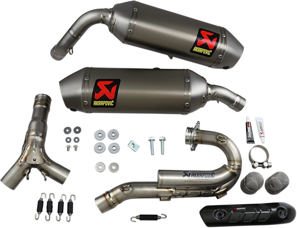 Perforated inner sleeve and inlet cap are all made of titanium, Flared or conical link pipe is made of titanium and welded to the muffler, Hexagonal mufflers feature a composite plastic outlet cap to match the design of each bike, Link pipe; header tube joint is milled on a state-of-the-art CNC machine and secured by high-quality, silicon-shielded tempered springs, Conical shaped header tube is made of titanium, Ceramic anti-seizing grease is used to prevent seizing, corrosion and excessive wear of parts of the exhaust system made of titanium (due to vibration and extreme temperatures), Carbon-fiber heat shield included, if called for in the design