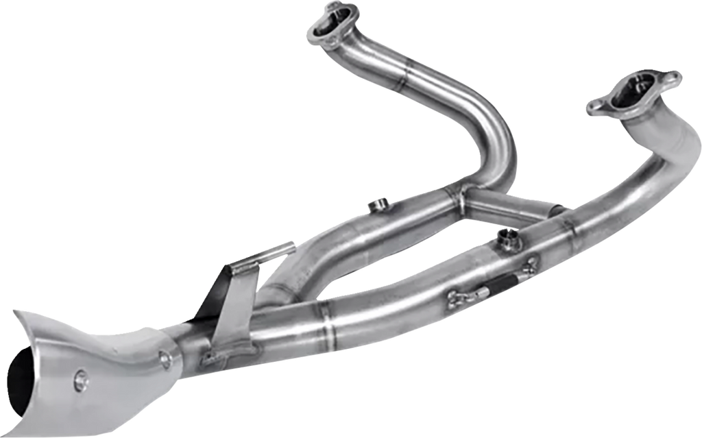 Constructed from high-grade titanium with a carbon-fiber heatshield, Intended exclusively for closed-course competition circuits only, Enhances performance and reduces weight, Tubes with a bigger diameter than the standard stock system and removal of the catalytic converter allow for enhanced gas flow, Pre-muffler offers a unique sound experience, producing a deep racing tone from the boxer engine, Upgrade results in a 54.84% (3.4 kg) weight reduction compared to standard stock, When combined with the Slip-On Line (Titanium), it boosts power by 3.1 kW (4.2 hp) at 7,800 rpm and torque by 5.9 Nm at 3,000 rpm, as tested on the Akrapovic dyno against a BMW R 1300 GS equipped with a standard stock system, Installation is plug-and-play, but remapping is mandatory