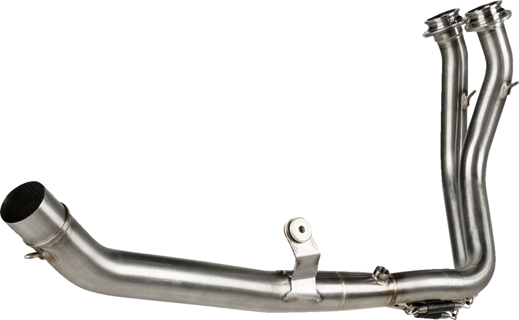 Increased performance and weight reduction for motorcycles already equipped with an Akrapovic Slip-On Line (Titanium) exhaust, Constructed from high-grade stainless steel and provides a 53.5% (1.8 kg) weight saving in comparison to the standard stock header, Developed with larger diameter tubes to allow improved gas flow with less restriction, the catalytic converter of the stock header is removed to add to the flow, When fitted with the Slip-On Line (Titanium), power is increased by 1.6 kW (2.2 hp) at 9,500 rpm, with a torque increase of 3.5 Nm at 6,700 rpm when compared to a Honda XL750 Transalp equipped with the standard stock exhaust system, Easy plug-and-play installation, with remapping recommended, but not mandatory, Closed-course competition circuits only.