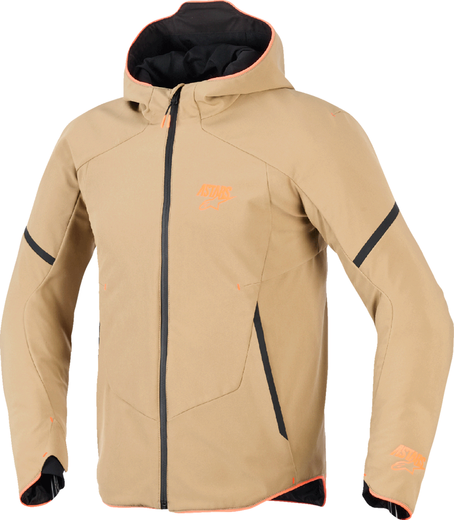 The Alpinestars Aeroshell Waterproof Jacket is designed for riders who demand both style and performance during their adventures. Crafted from a stretch softshell outer layer, this jacket provides an optimized fit and enhanced flexibility, ensuring comfort whether you're on a naked bike, scooter, or casual touring ride. Its modern cut and aggressive hoodie style make it versatile for off-bike wear as well, seamlessly blending practicality with urban fashion. The jacket features a waterproof seam-taped internal membrane and a waterproof front zipper to keep you dry in wet weather conditions, making it a reliable choice for unpredictable weather. The integrated ventilation system, including overlap flaps and an open slot hood design, ensures superior breathability and climate control, keeping you comfortable during active rides or casual outings. The ergonomic sleeve cuffs and lower hem are designed for an optimal fit, while adjustable welded cuffs and hidden waist adjusters allow for a customizable and secure fit. The sleek, minimalist aesthetic is complemented by hidden zipped hand pockets for safe storage of essentials, maintaining a clean look. Optional upgrades include Alpinestars PLASMA full chest protector and back inserts, providing additional protection for riders seeking enhanced safety. Whether worn on or off the bike, the Aeroshell Waterproof Jacket offers a perfect combination of style, comfort, and weather resistance, making it a versatile addition to any rider*s gear collection.