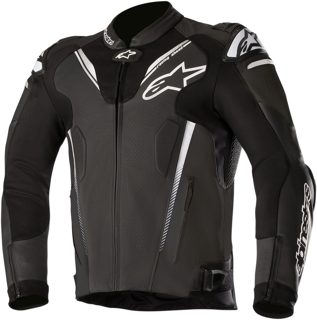 1.3mm high-grade leather construction with reinforcements at critical impact zones, CE-certified elbow and shoulder protectors, Aramidic stretch chest insert further improves the fit and feel, Cuff adjustment improves the range of fit and comfort, Critical displacement perforated panels on upper and lower body for improved ventilation, External Alpinestars exclusive Dynamic Friction Shield (DFS) technology shoulder and elbow protectors, race-proven in World Superbike and MotoGP, MotoGP profile, perforated, aerodynamic hump on upper back for improved aerodynamic performance and ventilation, Multiple external perforated leather panels with foam protector inserts, Large accordion stretch panels help movement and comfort on the bike, Aramidic stretch panels on sleeve areas help movement and further improve fit and feel, Multi-panel liner construction and 3D mesh inserts improve comfort and ventilation, D-ring waist adjustment for precision fitting, Removable security strap keeps the jacket positioned in case of an accident (feet-first slide), Neoprene comfort edge on collar, Interior arm cuff system features taslon fiber and nylon closures to help keep jacket firmly situated on body, Race-profiled, aerodynamic back-hump is ventilated to improve jacket’s cooling performance and breathability, Removable multi-panel lining and newly designed 3D mesh inserts to improve comfort and ventilation, Alpinestars exclusive Dynamic Friction Shield (DFS) external elbow protectors, tested in MotoGP, Removable, race-developed GP-R internal protectors offer lightweight performance and superior impact protection to shoulders and elbows, Innovative new elbow slider is anatomically contoured and incorporates a triple-density polymer compound for improved performance in crash slides. The elbow slider features a removable and replaceable screw-mounted insert slider for unsurpassed friction management, Chest and back pad compartments (Alpinestars Nucleon chest pads available as accessory upgrade, sold separately), Multiple snap-button system for integration of Alpinestars Nucleon back protector, which is available as an accessory, sold separately, Removable security strap, keeps the jacket positioned in accident, Multiple external perforated leather panels on shoulders with foam inserts