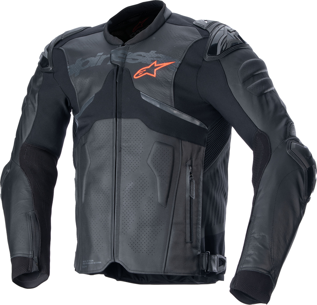 Atem v5 Leather Jacket is a racing jacket engineered and optimized for sports bike riders, with race-derived features, technology and materials including a dedicated *Race* fit with pre-curved arms for maximum riding performance, Alpinestars Flex Plus *Race* leather throughout, race-proven protection on the shoulders and elbows, while delivering optimum levels of rider comfort, Alpinestars composite stretch technology, A-CS? Plus, stretch panels on the torso for exceptional breathability, comfort, and freedom of movement, as well as delivering a lighter weight and a lower profile than a traditional leather accordion panel (the A-CS? Plus panels are about nine percent lighter than leather panels). Another key advantage of using A-CS? Plus is superior stretch performance; A-CS? Plus has about 30 percent elongation, and offers an increase in tear resistance of 300% compared to HRSF (Hyper Resistant Stretch Fiber), and an increase in cut resistance by 600% versus leather, RIDEKNIT? engineered inner arms; combines high abrasion and tear resistance with high flexibility, comfort and mechanical stretch while still delivering superior comfort and high levels of breathability, Flex Plus bovine *Race* leather construction is 10% lighter than regular bovine leather, while delivering 80% more adaptability for superior freedom of movement, an ultra-adaptive race fit, and enhanced abrasion and tear resistance, Extensive technical stretch panels under the arms, on the inner arms, and around the neck for an optimized fit, 3D pattern body mapping for an enhanced race fit, Dual density DFS RR shoulder and elbow protectors for superior friction control, GP elbow armor for additional impact protection in a key area, Nucleon Flex Plus shoulder armor for superior impact protection, Tech-Air? 5 and Tech-Air? 3 ready, Low profile sports collar construction for rider comfort and aerodynamic performance, Hook and loop neck closure with large built-in flap for a secure closure, Ergonomic hook and loop cuffs with a zippered sleeve on the forearm for ease of use, Streamlined speed hump for enhanced aerodynamic performance and enhanced ventilation, Hump is equipped with a chamber to accommodate hydration pouch, Waterproof inner compartment for safe and secure storage of valuables, Two zippered external side pockets for practical and secure storage, Mesh interior comfort liner with pockets to accommodate a back protector or a split chest protector, 3/4 waist zip for a secure connection with Alpinestars pants, Cut longer on the back for greater coverage in the riding position