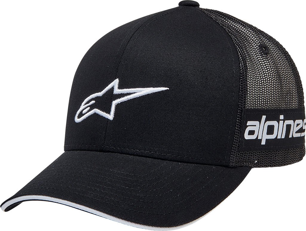 Back Straight Hat - Black - One Size Sandwich visor and structured crown, Embroidered Ageless 3D logo on front and Alpinestars Linear woven tape appliques on side of hat, Cotton twill front, polyester mesh back