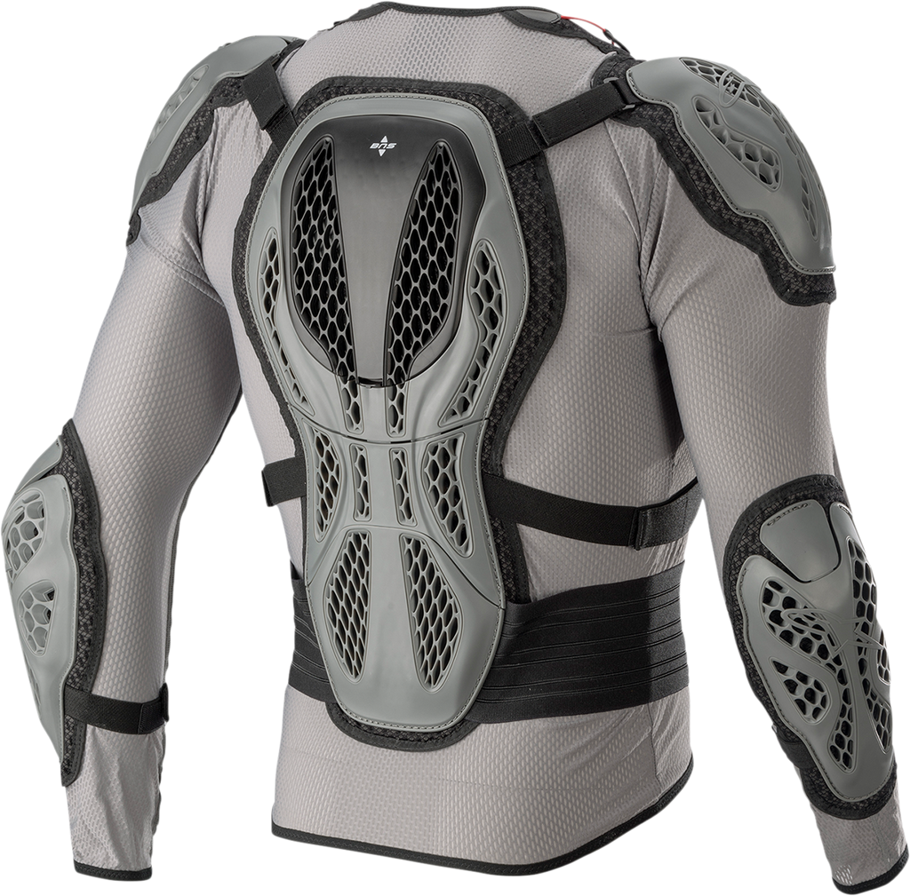 All components are engineered to offer a highly reduced material construction for a garment that is extremely light-weight, slim and highly ventilated, Technical elastane stretch mesh main construction is highly breathable and retains shape and structure, while keeping protection plates close to the body while riding on undulating surfaces, Versatile and customizable fit with removable upper back panel for compatibility with Bionic Neck Support (BNS), Plate design incorporates innovative integrated grid structure which, during an impact, absorbs and dissipates the energy forces across its cellular structure, All panel shells (back, chest, elbows and shoulder) are constructed from an injected polymer performance blend for optimized flexibility and excellent weight saving properties, Plates are ergonomically contoured to follow the natural curvature of the body and feature air channeling to improve airflow and prevent heat build-up, Back protector features three articulated plates to allow for greater flexibility and adaptive back fit in all riding positions, Plates ‘interlock’ in the event of a crash to reduce potential injury to the spine area, Thermoformed foam collar and shoulder for comfort and structure, All plates are mounted on PE padded panels which are highly perforated to offer fit and skin-touch comfort, Silicone pull tabs on shoulders for convenient and secure fitment of Alpinestars BNS, Elastic kidney with Thermoplastic Rubber (TPR) belt system for improved ergonomics and a customized, secure fit, Premium auto-locking YKK zips for main front closure, plus zip garage for improved comfort