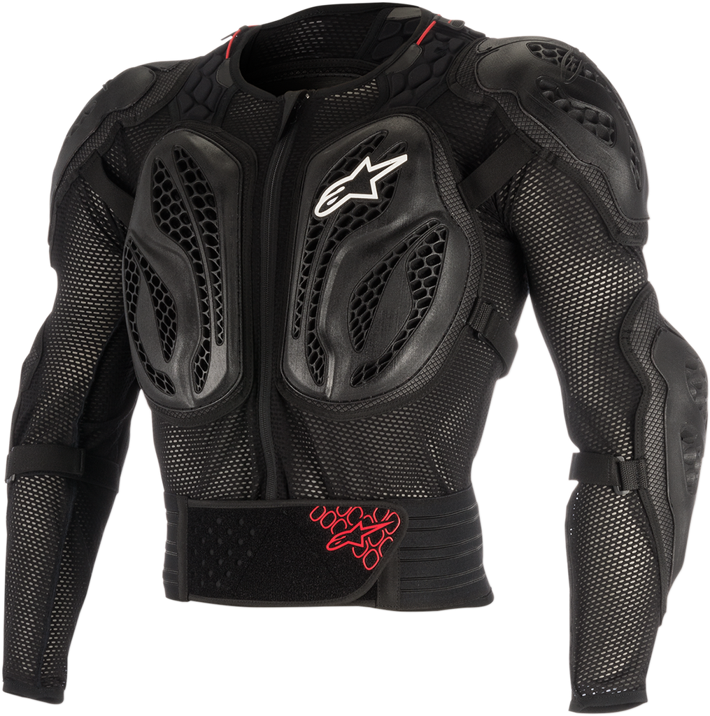Lightweight protective jacket with high adjustability and maximum breathability, Back protector developed in three waist-to-shoulder dimensions to cover all body sizes, All shells are constructed from a high-performance polymeric material blend for optimal flexibility and excellent weight-saving properties, All shells are highly perforated for maximum breathability and air ventilation, Single injected shells constructed with a back-integrated structure which absorbs and dissipates impact forces, Shells are vented and channeled to improve airflow and prevent heat buildup, Ergonomic protection shell contours follow the natural curve of the back to ensure an optimal fit while riding, Plates lock to prevent overextension of the back, Removable upper back panel for BNS compatibility, Shoulder and elbow adjustment straps for a custom fit, Lateral adjustment straps to tighten the back protector towards the chest shell for a secure fit, Kidney belt to tighten the back protector to the body, New technical elastane main construction is highly breathable and retains its shape, Premium auto-lock YKK zipper main frontal closure, Shoulder reinforcement for BNS attachment and position stability of the protector