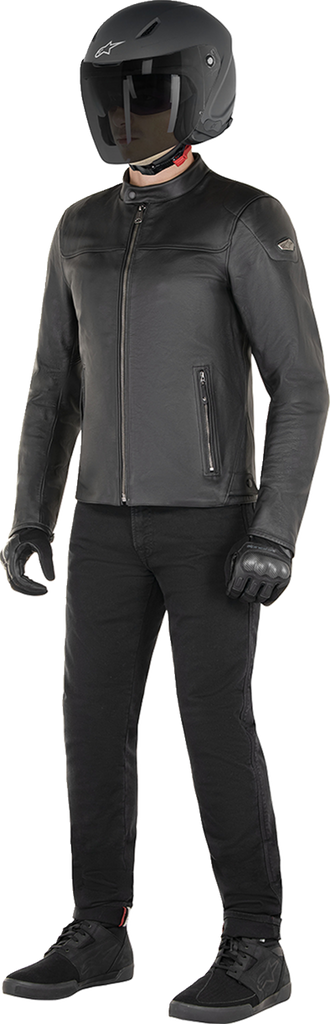 Alpinestars modern interpretation of the classic biker jacket, Equipped with a detachable thermal vest with 80g insulation at the front, adds to performance and versatility, Combines premium 1.0-1.2 mm lightweight, supple bovine leather with a tailored fit, Leather is dip dyed, and the oils used during the process results in a more natural finish with superior overall softness against the skin, Shoulder and elbow armor protectors are engineered with a low profile for a more tailored fit, Low profile elbow protectors for a more stripped back and elegant aesthetic, Tech-Air? 3 Ready, Integrated metallic gunmetal zip and metallic shoulder badge and trim for a premium finish, Leather accordion panels on the shoulder blades for an enhanced rider fit and optimum freedom of movement, Ventilation channels located on the rear area of the biceps for enhanced airflow, Perforated leather collar for additional airflow, Button and zip closure on the front, and button closures on the neck and wrist for a secure closure, Adjustable waist with buttons for an optimized fit, Zippered side pockets for real-world practicality, Loops for a secure attachment to Alpinestars riding pants, Mesh liner for superior rider comfort, Internal waterproof compartment for safe and secure storage of valuables