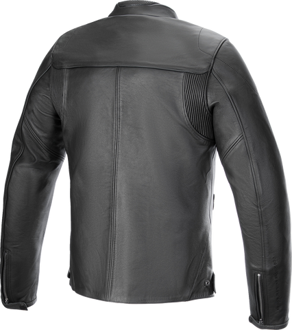 Alpinestars modern interpretation of the classic biker jacket, Equipped with a detachable thermal vest with 80g insulation at the front, adds to performance and versatility, Combines premium 1.0-1.2 mm lightweight, supple bovine leather with a tailored fit, Leather is dip dyed, and the oils used during the process results in a more natural finish with superior overall softness against the skin, Shoulder and elbow armor protectors are engineered with a low profile for a more tailored fit, Low profile elbow protectors for a more stripped back and elegant aesthetic, Tech-Air? 3 Ready, Integrated metallic gunmetal zip and metallic shoulder badge and trim for a premium finish, Leather accordion panels on the shoulder blades for an enhanced rider fit and optimum freedom of movement, Ventilation channels located on the rear area of the biceps for enhanced airflow, Perforated leather collar for additional airflow, Button and zip closure on the front, and button closures on the neck and wrist for a secure closure, Adjustable waist with buttons for an optimized fit, Zippered side pockets for real-world practicality, Loops for a secure attachment to Alpinestars riding pants, Mesh liner for superior rider comfort, Internal waterproof compartment for safe and secure storage of valuables