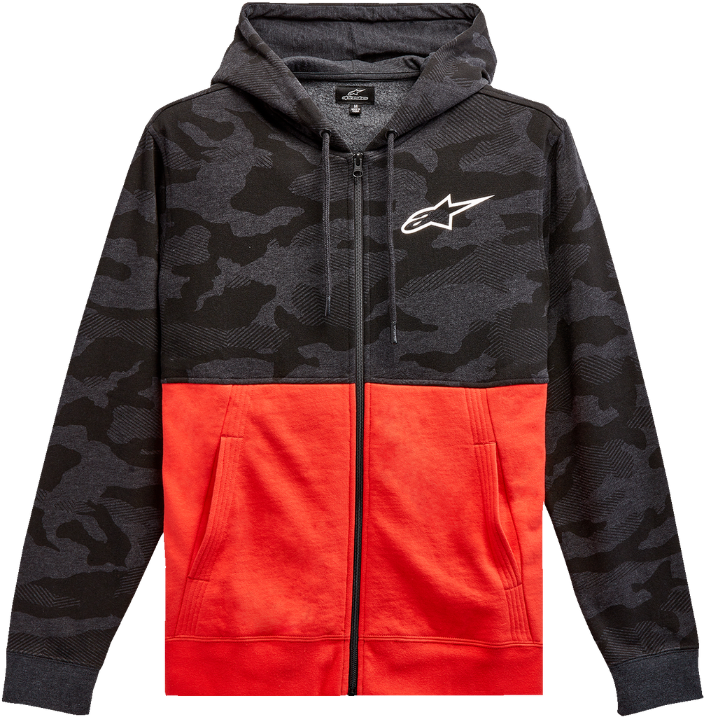80% Cotton / 20% Polyester, Fleece body blocked with all over camo, Front Alpinestars chest logo print, Jersey hood lining, dipped drawcord tips, rib cuffs and hem, Internal main label and external label branding