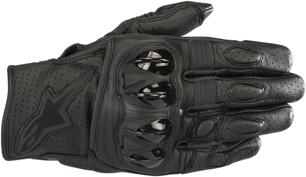 Durable, multi-panel main shell construction incorporating a supple full-grain goat leather for high levels of comfort, abrasion resistance and breathability, Alpinestars race-proven hard Polyurethane (PU) knuckle protection system for superior impact and abrasion resistance, Leather palm construction incorporates padding reinforcements on landing zone for excellent durability and comfort., Highly durable advance poly-fabric reinforcements on side of hand, pinky and ring finger, forming a finger bridge to prevent finger roll and separation during impacts, Perforated leather on backhand for cooling performance, Open knuckle gusset for improve levels of breathability and hand flexibility, Ergonomic stretch insert between thumb and palm offers flexibility to vastly improve hand movement