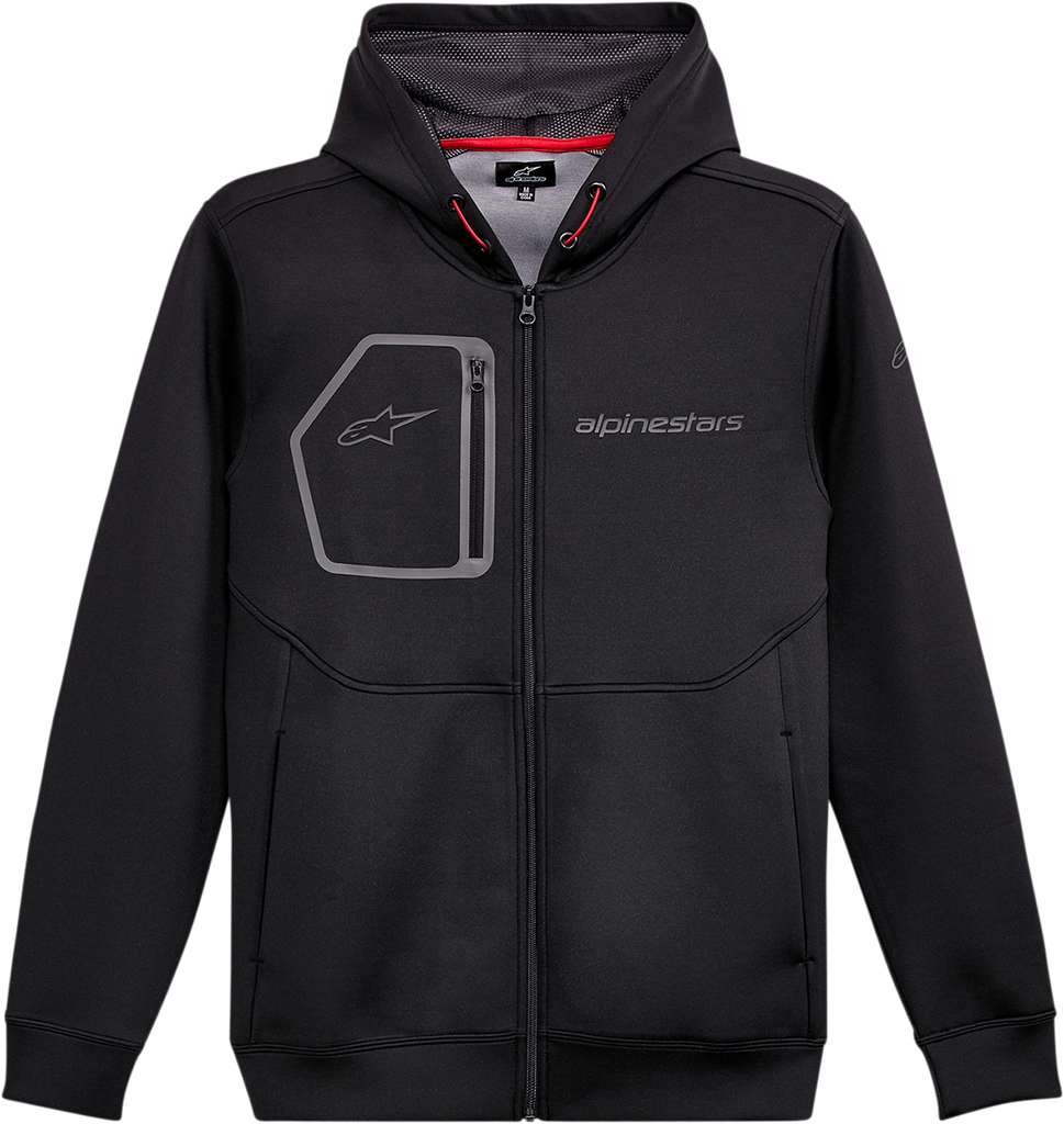 Double face tech fleece hooded with seaming, Adjustable hood closure, Mesh lined hood, on seam side pockets, self cuffs and hem, Concealed coil zip front, Zippered pocket with logo on right side of chest, screen-printed Alpinestars on left, Alpinestars graphic on left sleeve