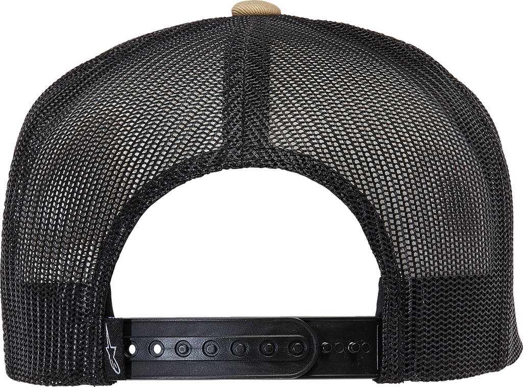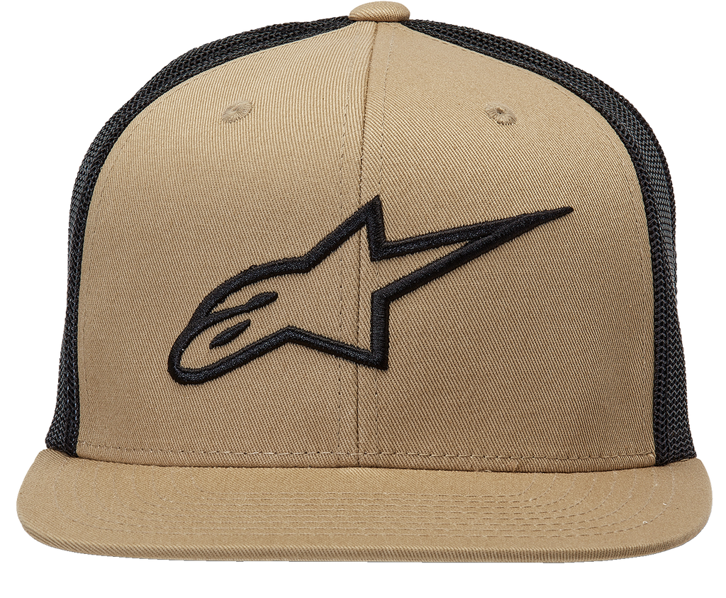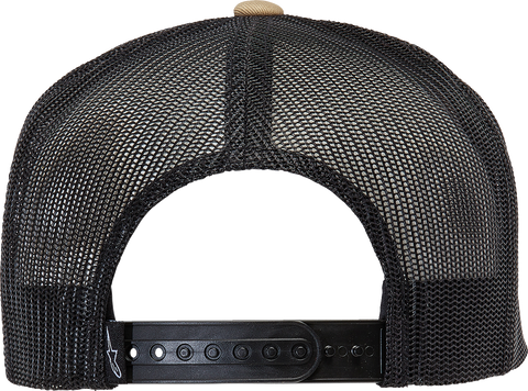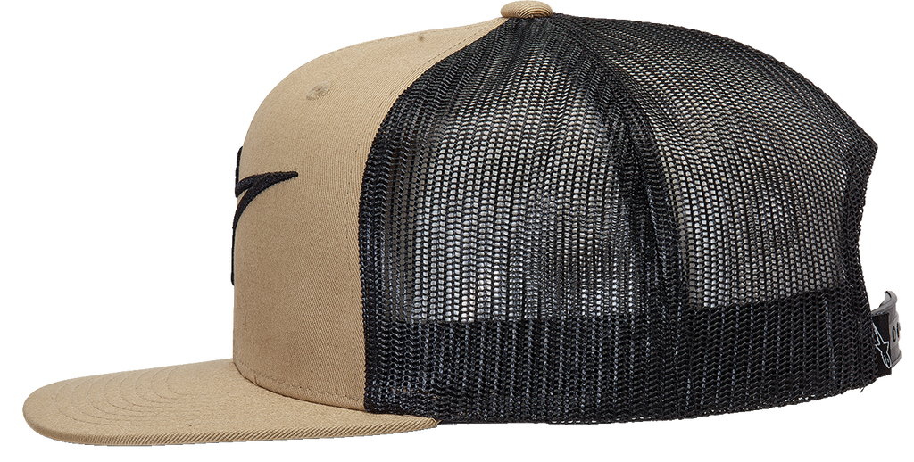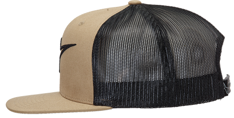 Corp Trucker Hat - Sand/Black - One Size Structured crown and snap back hat, Twill main front, mesh back fabric, Flat embroidered logo, Internal and back labeling, 60% Cotton / 40% Polyester
