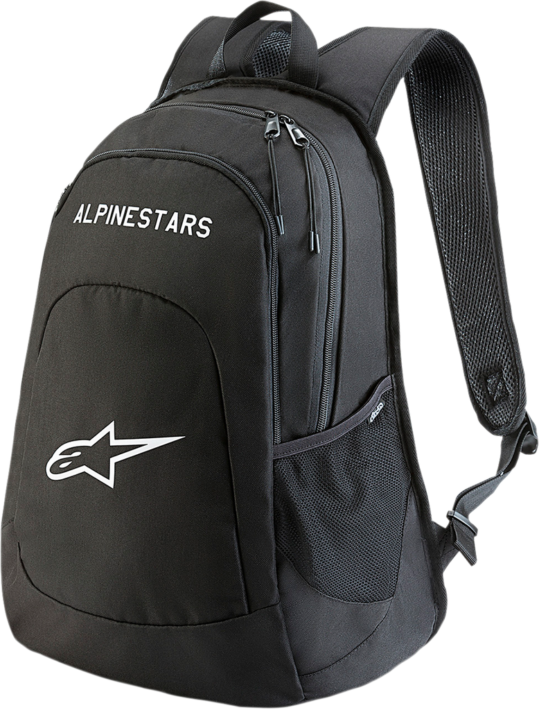 Small size daily backpack, Durable 600D Polyester, Front zipper pocket with organizer, Internal laptop sleeve and inner organizer pockets, Side mesh water bottle pockets, Padded back panel and shoulder straps, Contrast panels and zippers, Printed logo branding, Capacity: 13.45L