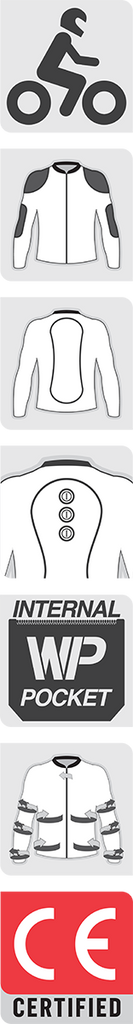 Full grain bovine leather main shell construction with natural finish for a soft, luxurious feel., Stretch panels on chest offer improved fit, movement and feel., Snap waist adjustment for personalized, riding fit., Two zippered hand pockets plus inner waterproof wallet pocket., Snap collar closure offers increased neck coverage., Pre-curved sleeves construction reduces riding fatigue and improves fit., Waist connection zipper allows attachment to Alpinestars riding pants., Leather patched logos for classic Alpinestars styling.