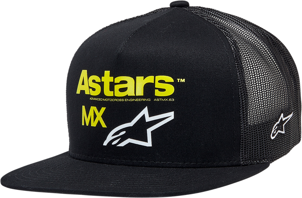 First Moto Trucker Hat - Black/Black/Yellow - One Size Front print MX logo graphic with embroidered side logo, Twill front and poly-mesh back, 60% Cotton / 40% Polyester