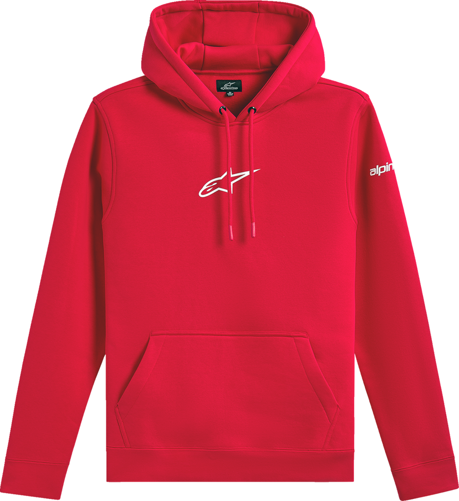 Designed with a striking gradient fade print, this hoodie showcases the Alpinestars logo prominently on the front, complemented by wordmark logos on the sleeves for a bold aesthetic. The kangaroo pocket adds practicality, providing a convenient space for hand warmth or small essentials. Internal and external branding details include a main label and external logo placement, emphasizing the brand's identity and quality.