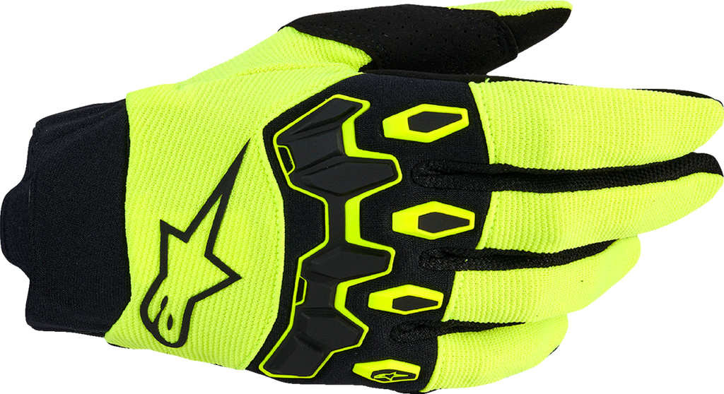The Alpinestars Full Bore V2 Gloves are engineered to deliver a perfect combination of protection, performance, and ventilation for motocross and off-road riders. Crafted from advanced, reinforced stretch fabric, these gloves provide an ergonomic fit that adapts to the rider's hand movements, ensuring comfort during intense riding sessions. The backhand features an innovative TPR knuckle protector designed to move with the hand, offering both impact resistance and flexibility for demanding motocross maneuvers. The breathable upper material enhances airflow, keeping hands cool and dry even during prolonged rides, while the ventilated stretch fourchettes improve mobility and control on the bike's controls. A neoprene cuff with an integrated wrist strap ensures a secure and personalized fit, minimizing slippage and maximizing comfort throughout the ride. The reinforced synthetic suede palm not only boosts durability but also allows for easy use of mobile devices without removing the gloves, making them ideal for multi-purpose riding scenarios. Perforated thumb patches add extra durability and airflow, enhancing overall abrasion resistance, while silicone print on the index and middle fingers optimizes grip on levers and handlebars. A pull tab with a silicone grip facilitates easy donning and removal, completing the glove*s user-friendly design. These gloves are perfect for riders seeking high-performance gear that offers protection, durability, and comfort in demanding riding environments.