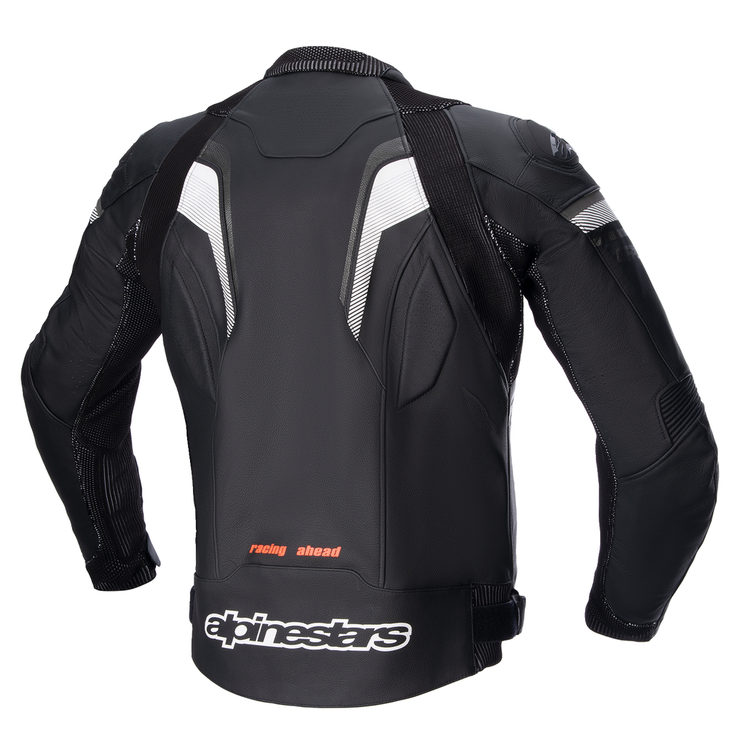 Tech-Air? 5 ready, Tech-Air? is the world*s first completely electronic, self-contained, full independent upper body motorcycle airbag system with no bike-to-rider setup configurations required, Chassis constructed from premium bovine leather for superior abrasion resistance, Knitted design leather jacket designed with a body mapped race fit and pre-curved sleeves and body for optimal riding performance, Advanced inner comfort liner construction and assembly for optimized flexibility and ease of use, thereby maximizing the knit panels function for an unrivalled sensation of freedom when the jacket is on, Engineered stretch panel inserts have been designed to accommodate Alpinestars Airbag System, allowing expansion when the airbag inflates but also offering a high level of anatomical performance and a superior fit when riding without the system fitted, Large mesh panel on back of collar for optimized levels of airflo, Level 1 Nucleon Flex Plus armor on shoulder and elbow (Nucleon chest and Nucleon back protectors available as an accessory upgrade), Knitted technology fabric on seam area for programmed stretchability, thus optimizing fit and comfort, DFS Lite on shoulders for enhanced impact protection and abrasion resistance, Rear of the jacket is elongated for enhanced coverage when riding, Low profile collar construction with soft lining for enhanced rider comfort, Hook and loop waist and cuff with semi-automatic zip for a secure closure, Coil main zipper for ease of use, even with gloved hands, Upper side vents for optimal airflow, Two front zippered pockets, inner waterproof document pocket and two inner pockets on the liner for safe and secure storage, Waist connection zipper allows attachment to Alpinestars riding pants, Reflective details