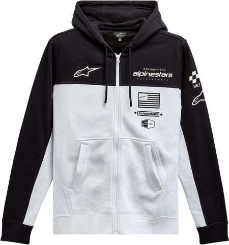 80% Cotton / 20% Polyester, Fleece body color blocked, Race inspired multi-hit front, sleeve and back graphic, Jersey hood lining, dipped drawcord tips, rib cuffs and hem, Internal main label and external label branding