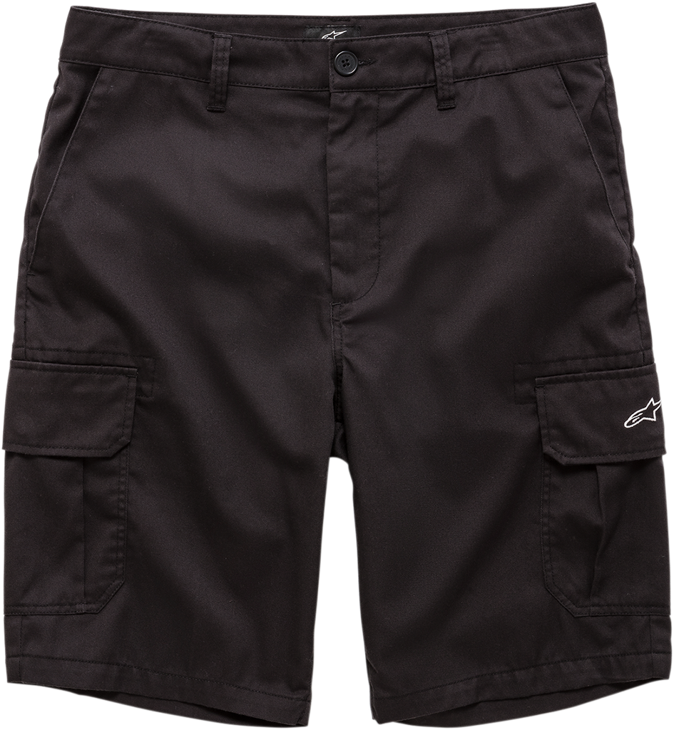 Classic cargo short with slash pockets and zip fly, Cargo pockets with hidden snap flaps, Back welt pockets with hidden snap flaps, Embroidered logo on back flap and left cargo flap, Internal main label, external labeling, 65% Polyester/35% Cotton