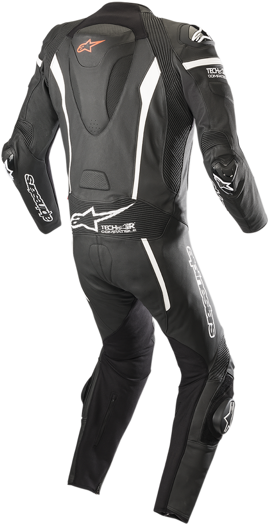 Multi-panel, fully anatomically profiled riding suit constructed from full grain bovine leather for optimized levels of performance, durability and abrasion resistance, Updated performance fit for greater comfort and fit, Compatible with Alpinestars’ class-leading Tech-Air® airbag system, Designed with stretch gussets on rear to accommodate suit’s inflated volume without compromising seam strength or material integrity, Tech-Air® compatibility, LED display on sleeve indicating airbag’s operational status, plus internal conduit for system vest’s ECU, Internal hook and loop grip closure fixings plus cable conduits in order to seamlessly accommodate airbag system, Replaceable Alpinestars Polyurethane (PU) Sport knee sliders can be positioned according to riding style, Alpinestars’ Hyper-Res Stretch Fiber (HRSF) stretch inserts on crotch, back and underarms for excellent fit and movement, Accordion leather stretch inserts on lumbar, knees, elbows and rear shoulders for excellent fit and reduced stress on body while in riding position, Back hump is aerodynamically sculpted for superior air flow and performance at high speeds, Pre-curved sleeves and legs construction for comfort and fit, Strategically positioned perforation panels for maximum ventilation and suit breathability, Integrated Polyethylene (PE) foam padding on the chest, hips, coccyx and upper arms, Removable mesh inner liner for convenience and breathability, Interior waterproof wallet pocket for safe and secure storage, Zippered calf expansion gussets fit wide range of leg sizes and thicknesses for comfort, Alpinestars race-derived, internal elbow, shoulder, knee and tibia protectors, Dynamic Friction Shield (DFS) external dual density Thermoplastic Polyurethane (TPU) sliders on shoulders and knees, Innovative new (removable) elbow slider is anatomically contoured and incorporates a triple-density polymer compound for improved performance in crash slides, Chest pad compartments with advanced poly-foam padding (CE certified Nucleon chest pads available as accessory upgrade, sold separately)
