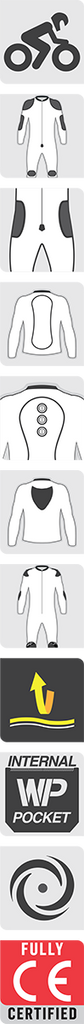 3D textured fabric comfort collar construction, Pre-curved sleeve and leg construction reduces fatigue, Localized perforations for improved ventilation and interior cooling, Stitched leather graphic and printed graphic detailing for an eye-catching look, Calf expansion gusset for optimized fit for range of lower leg sizes, Hook and loop grip cuff and ankle closure promotes close and secure fit, Unique, new heavy duty full circumference waist connection zipper to securely fasten upper and lower garments together, giving the suit the same silhouette as a one-piece suit, Internal hook and loop grip closure fixings plus cable housing seamlessly accommodate the airbag system, Durable premium leather main chassis constructed from 1.3 mm high grade leather, Large accordion stretch panels on the knees, shoulders and elbows aid movement on the bike, Stretch fabric panels on the sleeves and crotch further improve fit and feel, Ergonomic back hump, sculpted for better airflow and performance at high speed, Chest pad compartments (Alpinestars Nucleon chest pads available as accessory upgrade, sold separately), Multi-layer knee construction complete with reinforced grippy texture material on the inside allows the rider to better hug the bike’s tank, thus reducing fatigue and improving control, Full mesh inner liner for convenience and breathability, Inner waterproof wallet / document pocket for secure storage of small items, Innovative elbow slider is anatomically contoured and features a removable and replaceable screw-mounted insert slider, DFS (Dynamic Friction Shield) external dual density Thermoplastic Polyurethane (TPU) sliders: shoulder and knee for class-leading abrasion resistance, Jacket can be worn as a standalone item