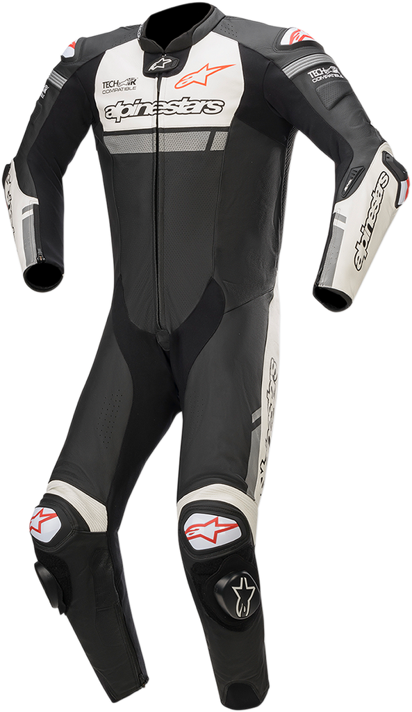 Tech-Air ® compatible, Premium leather main chassis constructed from 1.3mm genuine bovine leather, Large accordion stretch panels help movement and comfort on the bike, HRSF stretch fabric panels on sleeves, crotch further improve fit and feel, Ergonomic back hump, sculpted for better airflow and performance at high speed, Pre-curved sleeve and leg construction, Large perforated leather panels for maximum ventilation, Localized perforations highly improve ventilation, Printed graphic details, Calf expansion gusset, Integrated padding for increased comfort and protection, Chest pad compartments for Alpinestars Nucleon chest pads available as accessory upgrade, sold separately, Multi-layered knee construction reinforced with grip texture for optimal bike contact, Removable inner mesh liner for convenience and breathability, Inner waterproof wallet pocket, Comfort fabric on collar, Innovative new elbow slider is anatomically contoured and features a removable and replaceable screw-mounted insert slider, Dynamic Friction Shield (DFS) external dual density TPU sliders on shoulder and knee, Removable and replaceable Sport knee slider