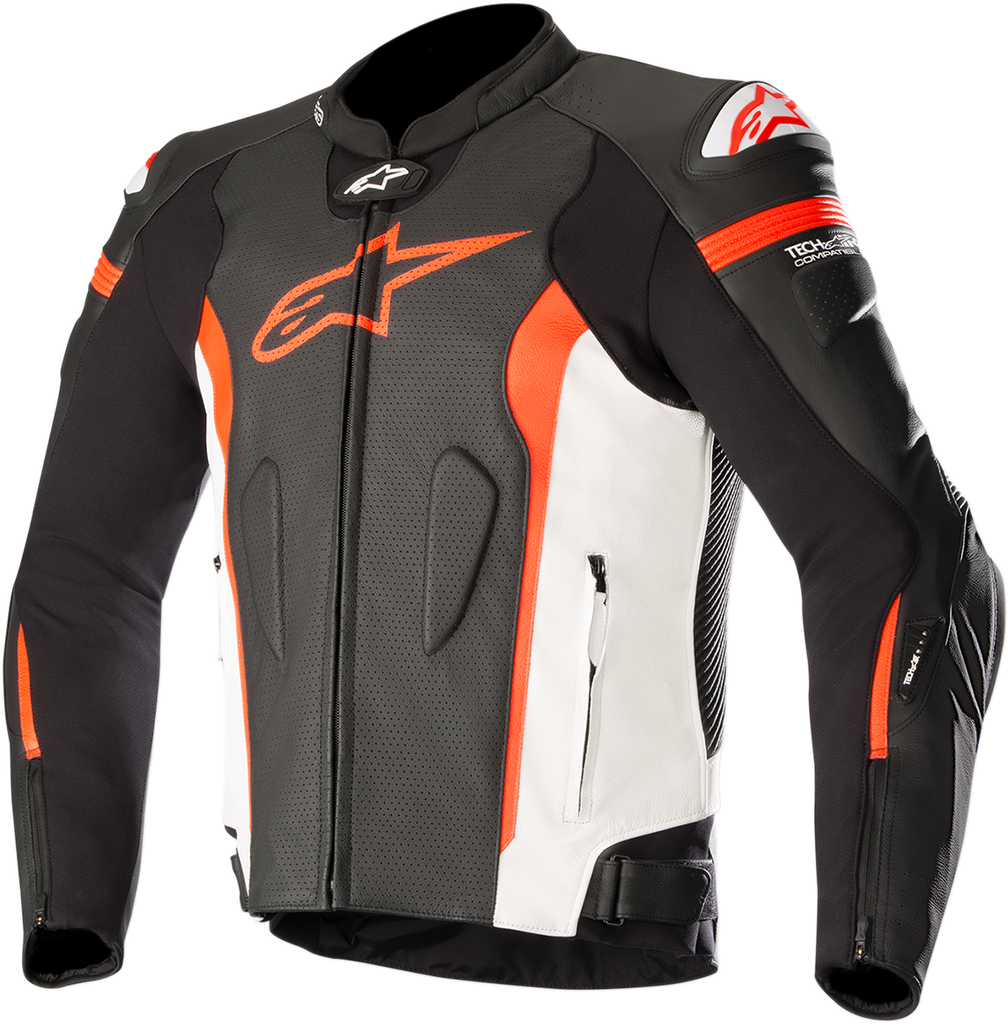 Multi-panel, fully anatomically profiled performance riding jacket constructed from full grain bovine leather for optimized levels of performance, durability and abrasion resistance., Featuring an updated performance fit for improved anatomical profiling leading to greater comfort and fit., Compatible with Alpinestars’ class-leading Tech-Air® airbag system., Designed with calibrated stretch gussets on rear to accommodate suit’s inflated volume without compromising seam strength or material integrity., The jacket’s ergonomic design means that it can be worn without the airbag system for a personalized fit., LED display on sleeve indicating airbag’s operational status, plus internal conduit for system vest’s ECU., Internal Hook and loop grip fixings plus cable conduits to seamlessly accommodate airbag system., Class-leading protective capabilities – internally and externally., Alpinestars race-derived, internal elbow and shoulder protectors., External (DFS dual density Thermoplastic Polyurethane (TPU) shoulder and elbow sliders offer abrasion resistance in key impact areas., Snap connection system allows integration of Nucleon Race Back Protector for the ultimate in protection (for use without Tech-Air® system)., Chest and back pad compartments with poly-foam padding (Nucleon chest pads available as accessory upgrade, sold separately)., Removable security strap, keeps the jacket positioned in accident., Alpinestars’ Hyper-Res Stretch Fiber (HRSF) stretch inserts on back and underarms for excellent fit and movement., Ergonomic back hump is sculpted for better airflow and performance at high speed., External, large-opening front hand pockets are zippered for peace-of-mind closure., Multiple internal compartment pockets feature hook and loop grip closure for additional security., Interior waterproof wallet pocket for safe storage of documents/electronics., Waist connection zipper allows attachment to Alpinestars riding pants., Premium YKK® zippers used throughout garment for durability., Reflective detailing for improved rider visibility., Strategically positioned perforation panels for maximum ventilation., Padded panels integrated into main shell and sleeves for improved fit., Mesh liner construction for improved breathability, comfort and ventilation; mesh liner is safely held in position via hook and loop grip connectors on sleeves.