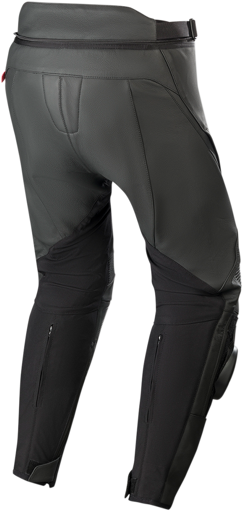 Premium leather main chassis constructed from 1.3 mm genuine bovine leather., Accordion leather stretch zones above the knee offer improved flexibility., Extended high rear waist construction provides greater overlap with the riding jacket., Extensive stretch panels on calf and crotch area for improved fit and feel., Pre-curved leg construction helps improve fit and reduce riding fatigue., Strategically positioned zippered ventilation on thigh for internal air cooling., Waist connection zipper allows attachment to Alpinestars riding jackets., D-ring waist adjustments offers a snug fit that can be personalized to a rider’s body frame., Hook and loop ankle adjuster for secure and personalized fit., Internally reinforced seat area with extra stitching., Internal mesh lining with stretch panel inserts work in conjunction with outer stretch zones for freedom of movement.