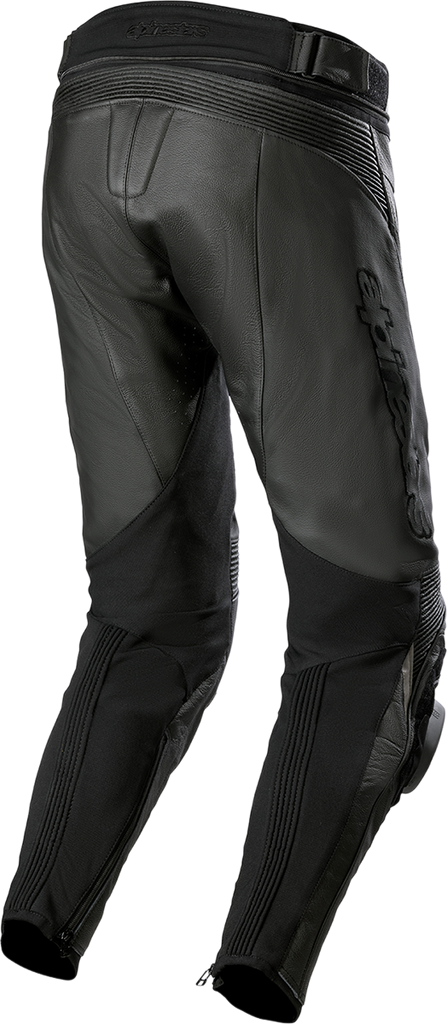 Featuring an engineered fit designed to deliver the highest level of active race protection, these pants are Tech-Air® ready and can accommodate the Tech-Air®10 Airbag System with its extended hip protection (sold separately), Perforated leather panel for optimal airflow, Comfort fit; design follows the contours of the knee for the optimal blend of comfort and freedom of movement, Dual layers in exposed areas for additional abrasion resistance, Premium leather main chassis constructed from 1.3mm genuine bovine leather, ‘High Flex’ design for an optimized fit and enhanced freedom of movement, Accordion leather stretch zones above the knee offer improved flexibility, Extensive stretch panels on calf and crotch area for improved fit and feel, Pre-curved leg construction helps improve fit and reduce riding fatigue, Extended high rear waist construction provides greater overlap with the riding jacket, Strategically positioned perforated leather panel on thigh for internal air cooling, Waist connection zipper allows attachment to Alpinestars riding jackets, Alpinestars GP-R Lite internal protection on knee, Hook and loop waist adjuster for secure and personalized fit, Internal mesh lining with stretch panel inserts work in conjunction with outer stretch zones for freedom of movement, Replaceable Sport knee sliders for excellent impact and abrasion resistance