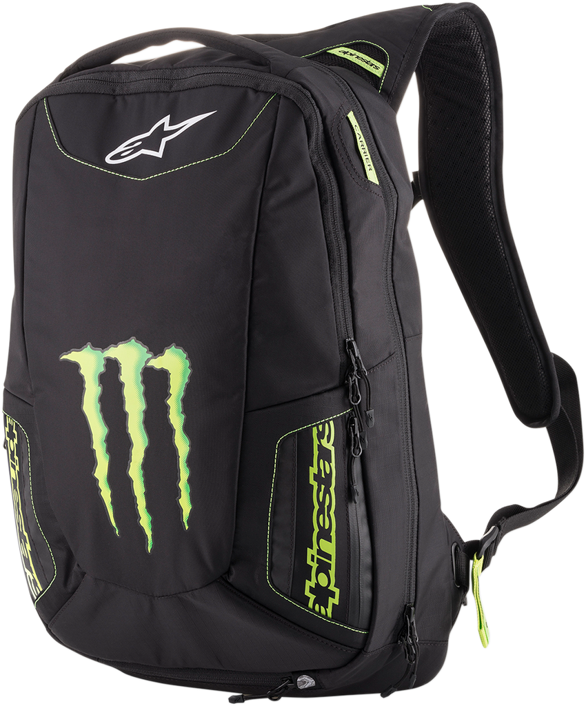 Computer compartment with full-length zip featuring 15” laptop protective fleece sleeve, Large main compartment with internal organizer featuring a smartphone protective fleece sleeve, Built-in helmet carrier, Rain cover stored in its pocket in the main compartment, Ergonomic shoulder belts with perforated foam padding and mesh panels for an optimized airflow, adjustable and removable sternum strap, Alpinestars quick release system for a fast and secure adjustment, preventing the extra webbing flapping, Ergonomic 15mm back padding preventing spine pressure with ventilation channels for an optimized air flow