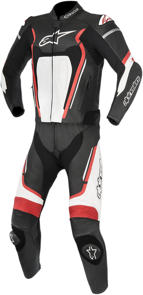 Constructed of premium 1.3mm full-grain bovine leather, Multiple-stitched main seam construction provides maximum tear resistance, High-density perforation zones throughout the suit plus perforated leather panels on torso and arms, Extended, reinforced stretch fiber panels on arms, crotch and legs, Accordion leather stretch inserts on lumbar, knees, elbows and rear of the shoulders, Removable CE-certified protectors on elbows, shoulder and knees, External Dynamic Friction Shield (DFS) shoulder sliders, Integrated foam padding on the chest, hips, coccyx and upper arms enhances fit and comfort, Snap connection system allows integration of Alpinestars CE-certified Level 2 Nucleon back protector (sold separately), Chest pad compartments with Polyethylene (PE) padding (Nucleon chest protector inserts available separately), Replaceable Polyurethane (PU) Sport knee sliders included, Removable mesh liner features built-in stretch inserts, Premium YKK fasteners, including flat-profile YKK semi auto-lock wrist zippers, Full-circumference zipper securely fastens jacket and pant together, Back hump is aerodynamically sculpted for superior airflow and performance at high speeds, Soft, 3D textured fabric collar for comfort, Arm and leg cuffs feature soft poly-fabric, Printed graphic detailing for unique style, Lightweight, contoured stretch calf panels plus zippered expansion gussets, Reflective detailing on arms and legs improve rider visibility in poor light conditions, Two exterior zipper closure pockets, Interior waterproof chest storage pocket and wallet pocket