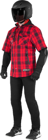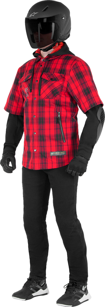 MSE Tartan Jacket is a half shirt, half hoodie riding garment, while providing full protection, Mid-season shirt jacket with short-sleeved look, detachable hoodie and exposed armor on the elbows, Constructed with an internal 9% elastane, 4-way stretch material with attached and exposed armor, and a high-resistance polyamide checkered pattern outer material, Treated with a water-repellant finish for greater comfort and usability in a wider range of climates, Exposed armor, Nucleon Flex Plus armor, perfect for a lightweight, breathable, and discrete look, Features a zippered main closure with external snaps, zippered hand pockets, and an internal waterproof compartment, The shirt has pant connection loops, a sublimated internal mesh liner, and detachable hood to make it practical for every day wear