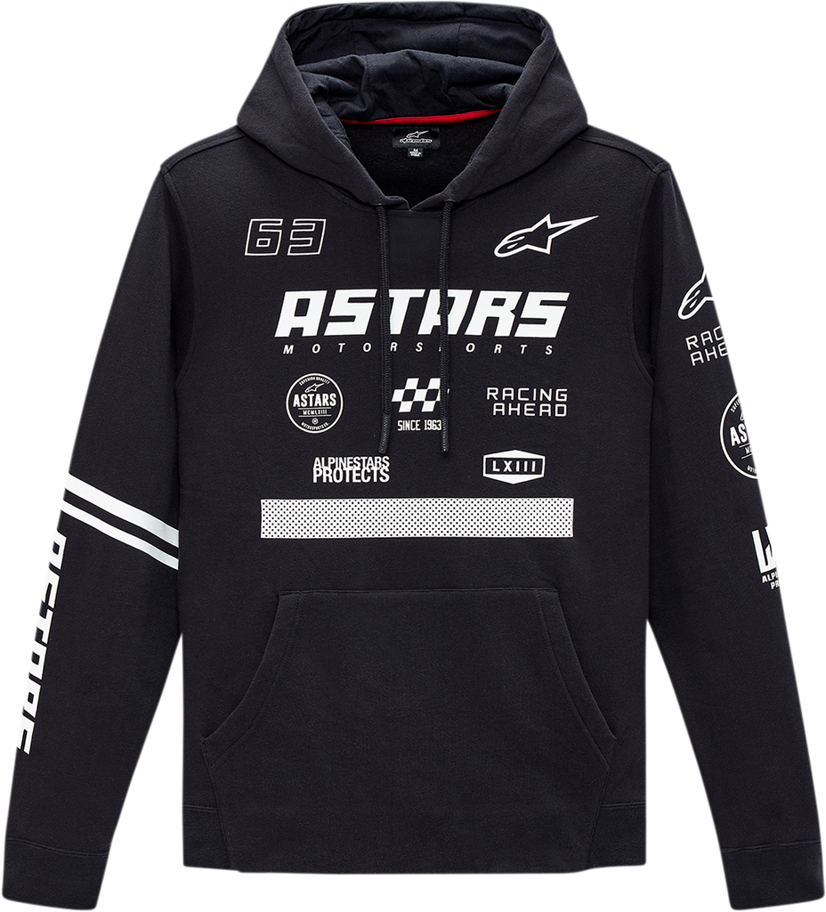 Multiple race inspired graphic logos, Hooded pullover fleece with jersey hood lining, Internal main label and external label branding, 80% Cotton/20% Polyester