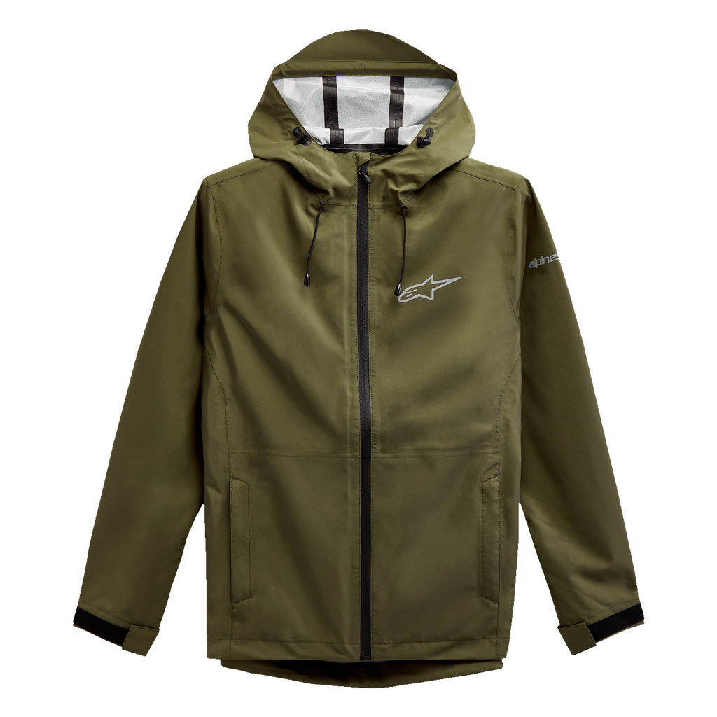 Rain jacket with mechanical stretch water resistant 2.5L fabric and taped seams , Bungie adjusters at hood and hem, Hook & loop adjuster tabs at cuffs , Fixed hood, pre-curved arms, coated reverse coil front zipper, zipper hand pockets , Internal main label and external label branding with logos at chest and left sleeve