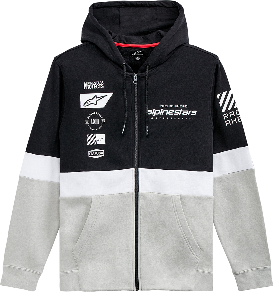 Position Zip Hoodie - Black/White - 2XL Screen-printed graphics on front, back and left sleeve, Drawstrings with finished ends, Finished edge kangaroo pockets on front