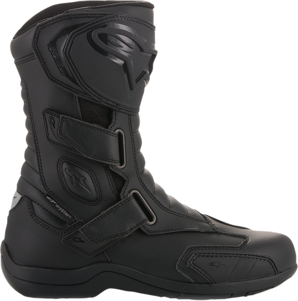 Main upper is made of advanced microfibers for durability and long-lasting comfort, Incorporates ergonomic toe box construction for improved compatibility with the motorcycle controls and a superior, wide-ranging foot profile for superior fit and comfort, Internal heel counter and toe box for enhanced structural rigidity, TPU shin plate and shift pad offer support and resistance to impacts, TPR design on lateral toe gives more flexibility and resistance against abrasion, Drystar® membrane layer between boot upper and inner lining, Three adjustable lateral hook-and-loop straps for secure boot closure and a personalized fit, Straps feature TPU pull tips for ease of use and durability, Internal toe box and heel counter protection layered under the boot upper for durability, improved feel and performance, Comfortable and durable technical textile collar lining, Dual-density ankle protectors are backed with foam inner padding for protection on both ankle sides, High-modulus midsole follows the shape of the foot and incorporates a structured shank reinforcement, Innovative, weight-saving laminated technology is utilized on the shin plate for a lightweight yet strong guard against impacts, Removable anatomical footbed features EVA foam and textile construction for comfort and support, Rear and lateral reflective inserts for improved visibility, Vulcanized compound boot sole