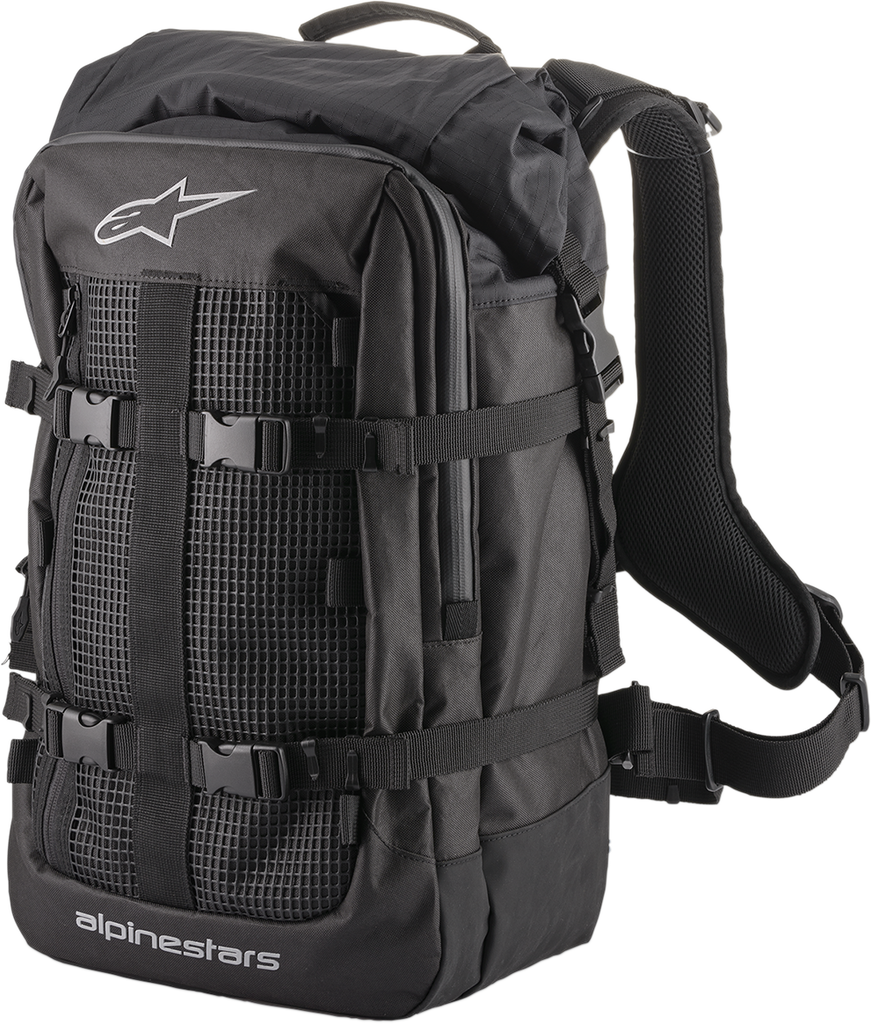 32.4-litre capacity adventure touring backpack with ergonomic design for rider comfort, Clever compression design means that if the front compartment is empty, it will flatten with the compression straps to lay flat against the main compartment, Large and tall roll top main compartment for quick and easy access, with a removable waterproof liner, Equipped with multiple external pockets for quick access to contents, Expandable side pods with zippers for extra capacity, Front large zipper pocket, side entry front panel pocket and small items pocket on the lid for storage of essential items, Hydration pocket for rider comfort, All straps are finished with easy pull ends for ease of use, with tie down loops for added security.