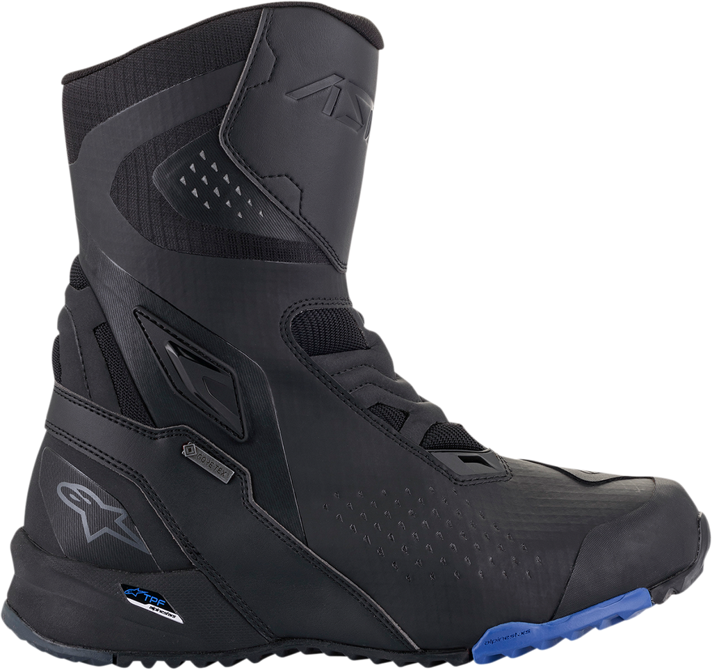 The RT-8 has a full Gore-Tex membrane for 100% guaranteed waterproof performance and breathability., Technical modern upper constructed with an advanced blend of microfiber and synthetic high resistance textile laminated by a seamless PU for enhanced breathability, Alpinestars integrated Transversal Protection Frame (TPF) protects the foot while delivering the necessary support on the footrest without compromising the front foot flexion for superior walking comfort, Reinforced heel counter and toe box, with an additional shift pad extra layer and a reinforced shin area to protect against impacts, Innovative instep fast lace adjuster controls the instep volume of the boot for a precise fitment and retention, The boot opening is managed by lateral zip mounted on elasticated panel, covered by a hook and loop gusseted flap, to protect the zipper and maintain the boot’s flexion, New sole unit for optimal protection and walking comfort, Innovative internal volume adjustment system, Optimized upper construction comfort associated with a Gore-Tex membrane