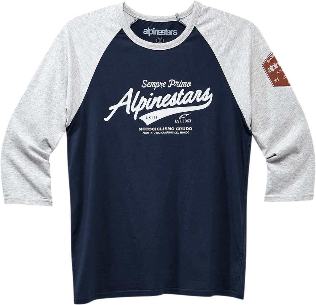 Raglan sleeve baseball style premium tee, Script word graphic on chest, badge logo graphic on shoulder, Soft water base print, Internal Alpinestars neck print