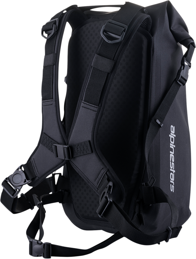 100% Waterproof seam sealed construction with roll-top upper closure for ease of use and side buckles to keep the pack compact when closed, Shoulder strap engineered specifically for motorcycling use, with magnetic central connection for ease of use, Semi-rigid foam back wall construction for rider comfort, Stable harness with adjustable torso length can be operated by one hand for ease of use, Quick-release magnetic center buckle and lower strap release buckles for easy on and off, Removable waist belt for an optimized fit, Waterproof slider zipper for wet weather performance, Single external waterproof pocket for secure storage of valuables, Internal padded laptop pocket, Black matte finish with high-visibility silver reflective branding