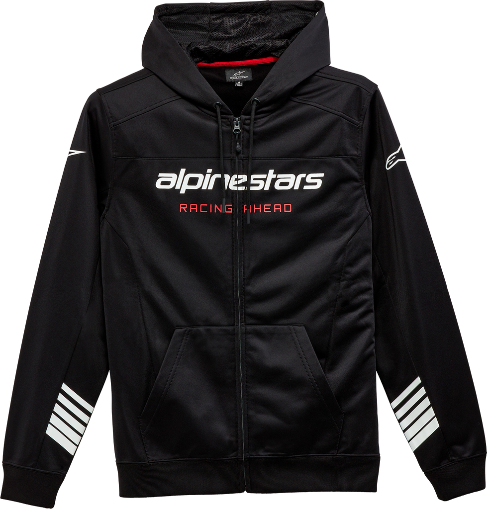 Hooded zip-front 100% polyester fleece with contrast panels, Mesh lined hood, tech draw cords, rib cuffs and hem, Alpinestars word logo and graphics on chest and arms, Internal main label and external label branding