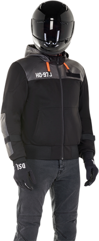 Nucleon Plus shoulder and elbow protectors for superior protection against impacts, Two front main pockets and an additional small pocket for safe and secure storage of valuables, thus adding to the jacket’s real-world practicality, Ergonomic elbows for enhanced comfort and reduced rider fatigue, Hood offers effective protection against the elements off the bike, Elbow strap adjustments allow the fit to be adjusted, thus reducing material bunching and enhancing rider comfort