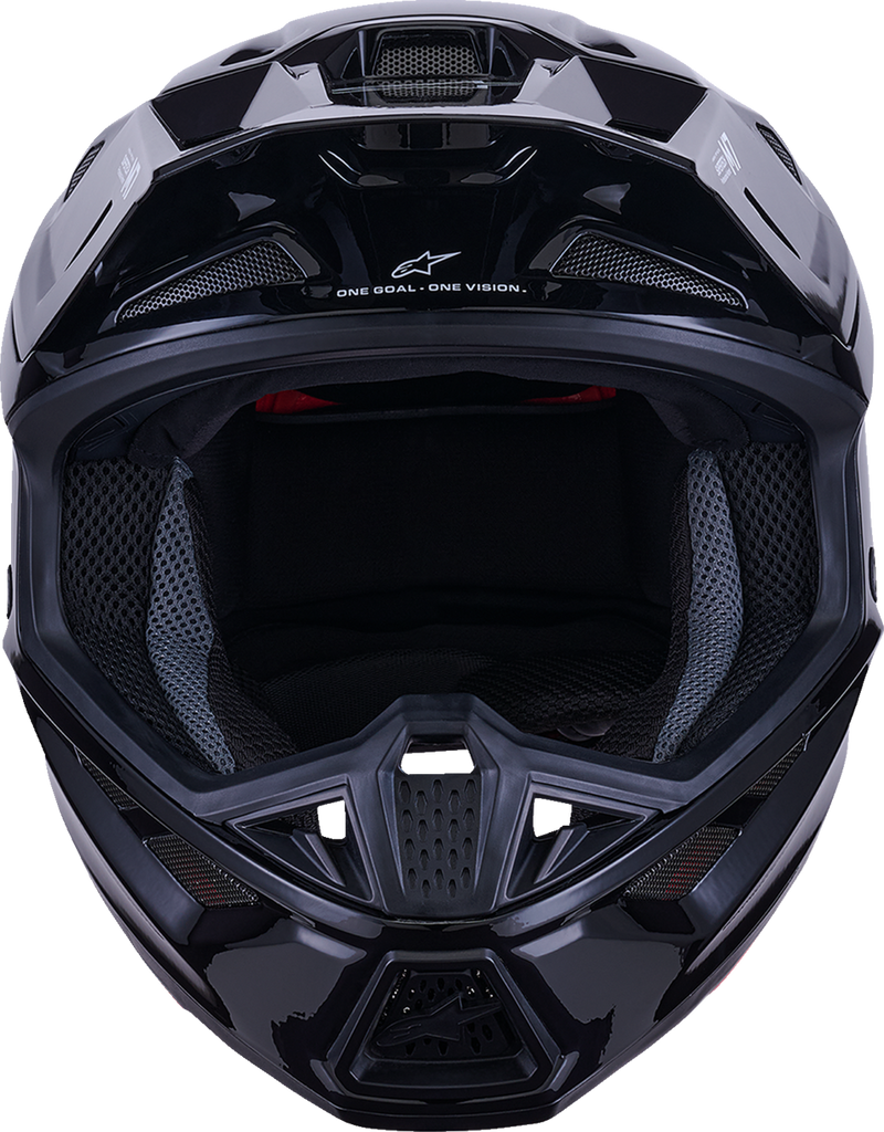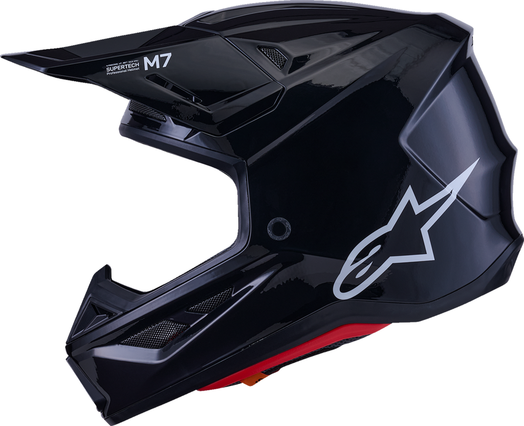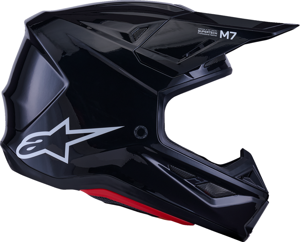 The Alpinestars SM7 helmet in solid gloss black in size 2XL is engineered specifically for off-road racing enthusiasts seeking superior impact protection combined with optimal ventilation. Its lightweight construction incorporates a composite shell designed to maintain high aerodynamic efficiency, promoting smooth airflow around the helmet to reduce drag and enhance rider stability during high-speed maneuvers. The shell's aerodynamic profile features a streamlined shape free of external channels, minimizing load points and ensuring robust integrity while its curved surface design helps reduce friction upon impact, effectively deflecting energy away from the rider's head and neck. Equipped with 20 individual intake and exhaust ports*13 intakes and 7 exhausts*the helmet ensures excellent airflow, keeping riders cool and comfortable even during intense off-road sessions. The helmet's fit can be further tailored using the interchangeable cheek pads available in various thicknesses, providing a customizable fit that enhances comfort and safety. Additionally, the helmet is communication system compatible, with a cutaway section on the left side of the EPS for seamless integration of intercom systems and earphone recesses on both sides for speakers, making it suitable for communication during races or training. The removable and washable linings, treated with antimicrobial fabrics, promote hygiene and long-term freshness. The crown pad and neck pad are elastically connected to better manage oblique impacts, while the adjustable top pad allows height customization via the A-head system for an optimal fit. The cheek pads, made from 3D foam with an emergency extraction system, are interchangeable among all sizes and include channels for hydration tubes. The chin strap features a 25 mm nylon strap with stainless steel DD rings and removable covers for cleaning. Integral channels on both sides of the helmet accommodate hydration systems, ensuring riders stay hydrated without compromising safety. Safety features include a Visor Detaching System designed to release under impact energies exceeding 15 Joules, preventing helmet compromise, and Alpinestars' PLASMA technology integrated into the side pads enhances shock absorption in critical collision zones, significantly reducing injury risks. Overall, the Alpinestars SM7 helmet offers a perfect combination of advanced impact protection, customizable comfort, and superior ventilation tailored for off-road racing environments.